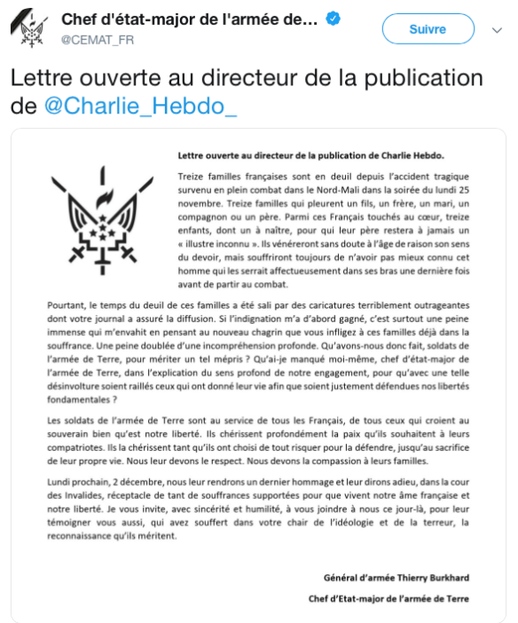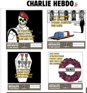 A l’occasion de la mort tragique de 13 soldats de l’armée française en opération au Mali, le journal satirique ultra gauchiste, Charlie Hedbo, remis sur les rails, renfloué du marasme économique par la nation toute entière, à la suite du terrible attentat de 2015, publie en « hommage » à ces malheureux soldats, des « caricatures » d’une indécence outrageante, d’un sordide et d’une ignominie dont seuls des cerveaux malades peuvent se prévaloir !