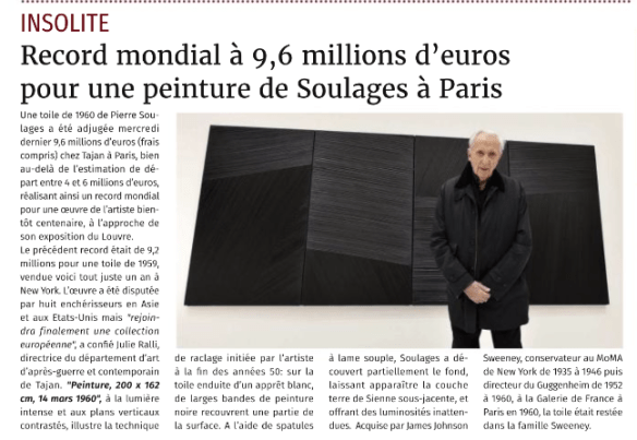 De nos jours, l’art contemporain désigne un juteux marché aux mains d’une coterie très fermée, un réseau mafieux d’artistes déracinés, déconnectés, dont le travail principal consiste à décrocher des subventions publiques (FRAC ou l’état passé maitre de l’art) pour aligner des carrés en plastiques sur fond blanc ou exposer des presses-purée, et ainsi faire monter leur cote jusqu’à des millions d’euros via des circuits financiers souvent opaques. C’est très rentable mais pas pour le contribuable qu’il dépouille en allant tanner les élus afin qu’ils acceptent d’exposer les productions hideuses de gens comme Soulage. C’est un art subversif, provoquant et conceptuel qui vise à éclipser l’art classique figuratif traditionnel qu’il vampirise en s’exposant toujours à ses côtés faute de quoi il trouverait bien peu d’admirateurs !