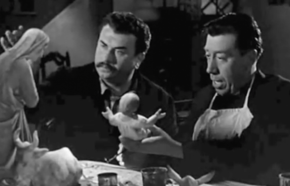 Don Camillo préparant la crèche devant le communiste Peppone !