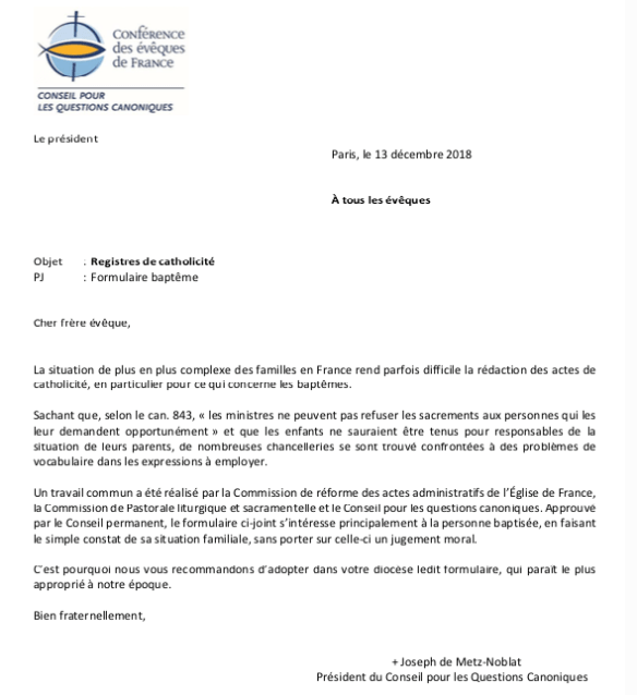 Depuis Vatican II, l’église concilaire a renoncé à enseigner la doctrine catholique et à condamner les pratiques déviantes, contre- nature. Elle a adhéré à l’idéologie du progrès ! il faut vivre avec son temps ! Aussi, dans une société qui reconnu aux invertis les mêmes droits qu’au commun des mortels, il fallait bien adapter le bapteme à la genderofolie du moment ! Alors, les évêques de France ont-ils adressé une note afin de biffer sur les actes de bapteme, les mentions de fils de ou fille de pour les remplacer par : les parents ou autres titulaires de l’autorité parentale !