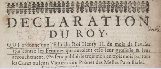 « Henri, par la grâce de Dieu, roi de France ; a tous présens et à venir, salut. Parce que plusieurs femmes ayant conçu enfants par moyens deshonnêtes, ou autrement, persuadées par mauvais vouloir et conseil, déguisent, occultent et cachent leurs grossesses sans en rien découvrir ni d éclarer ; et avenant le temps de leur part et délivrance de leur fruit, occultement s’en délivrent, puis suffoquent, meurtrissent, et autrement suppriment, sans leur avoir fait impartir le sacrement de baptême ; ce fait, les jettent en des lieux secrets et immondes, où les enfouiss ent en terre profane, les privant par tels moyens de la sépulture coutumière des Chrétiens. Ordonnons que toute femme qui se trouvera duement atteinte et convaincue d’avoir célé, couvert et occulté, tans sa grossesse que son enfantement, sans avoir déclaré l’un ou l’autre, et sans av oir pris de l’un ou l’autre, témoignage suffisant, même de la vie ou mort de son enfant, lors de l’issue de son ventre ; et après se trouve l’enfant avoir été privé tant du sacrement de baptême, que de la sépulture publique et accutumée, soit telle femme tenu et réputée d’avoir homicidé son enfant ; et pour réparation, punie de mort et dernier supplice, et de telle rigueur que la qualité particulière du cas le méritera. Donné à Paris, au mois de février 1556. »