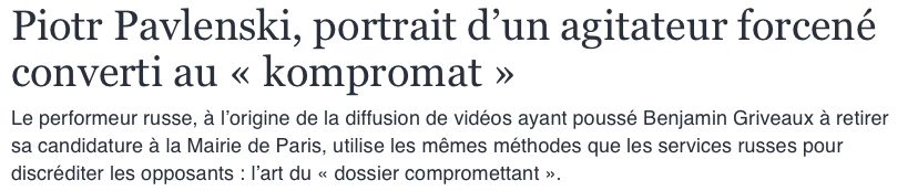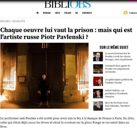 Toute la caste mediatico-politique éplorée chante les louanges de l’exhibitionniste déchu, et d’accuser les usagers des réseaux sociaux, les politicards de demander une levée de l’anonymat sur internet, le respect de la vie privée, l’arrestation immédiate de Piotr Pavlensky, cet escogriffe de l’Oural qu’ils encensaient il y a peu de temps encore parce qu’il avait la bonne idée d’être anti-Poutine, les bobos parisiens de regretter le retrait de la campagne du candidat à la libido débordante, qui a confondu élection avec érection, et Macron, qui il y a quelques mois entonnait en compagnie d’un groupe de rappeur invité à la fête de la musique ces douces paroles, ne t’assied pas salope, suce ma bite et lèche mes boules, enculé de ta mère, de menacer la Russie du feu nucléaire … et d’incriminer officiellement le président Russe de vouloir déstabiliser nos si belles démocraties !