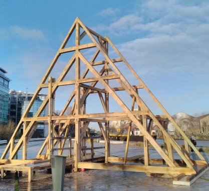Conçue en chêne brut, de structure triangulaire, la structure reproduit la « forêt » à l’aide de 13 fermes qui devront porter la très lourde couverture en plomb ! Elle est actuellement exposée à Pantin :