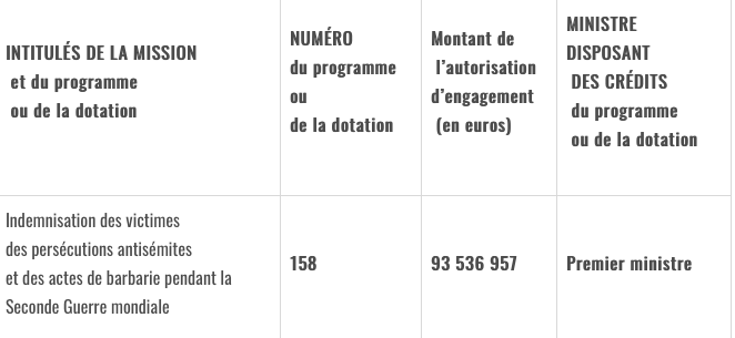 Il y a 75 ans que la seconde guerre mondiale est terminée, pourtant, au budget de la France en 2020, 93 millions d’euros sont prévus pour faire face à l’indemnisation des victimes des persécutions antisémites et des actes de barbarie ! La générosité de l’état avec l’argent des français est sans limite ! Il faut faire Téchouva !