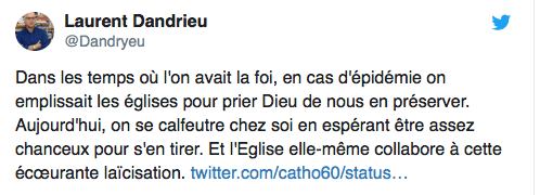 Epidémie de coronavirus, XXIs : l’Eglise conciliaire, vendue au monde (on participe à l’effort national disent les faux hommes de Dieu !) est prise par la peur, elle adopte des mesures inédites et empêche ainsi toute les grâces de retomber sur les fidèles !