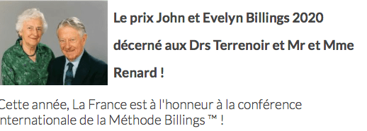 Cette année les docteurs François et Caroline Terrenoir ont été récompensés du prix Billings pour avoir traduit et mis à disposition des documents permettant de démocratiser la méthode. Grâce à eux, les professionnels de santé français pourront être formés sur cette méthode respectueuse de la femme, de la santé, de l’environnement et de l’amour mutuel des conjoints.