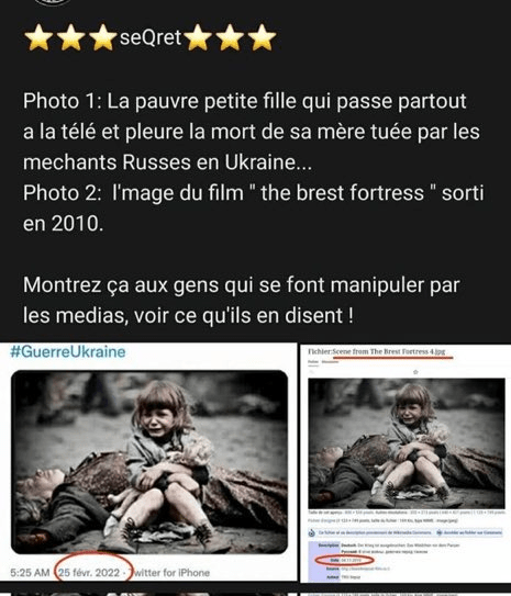 Cascade de fakenews pro-guerre et anti-russe toutes debunkées : – le héros aérien dit « fantôme de Kiev » n’existe pas – les photos de Zelinsky habillé en militaire au front datent de 2 ans – les 13 militaires de la fameuse île n’ont pas été exécutés mais sont vivants