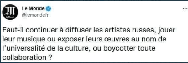 Le Monde voudrait boycotter les artistes russes ! Image Publié le 5 mars 2022 par la Solognote Partager : Cliquer pour partager sur X(ouvre dans une nouvelle fenêtre) X Cliquez pour partager sur Facebook(ouvre dans une nouvelle fenêtre) Facebook J’aime chargement… Similaire