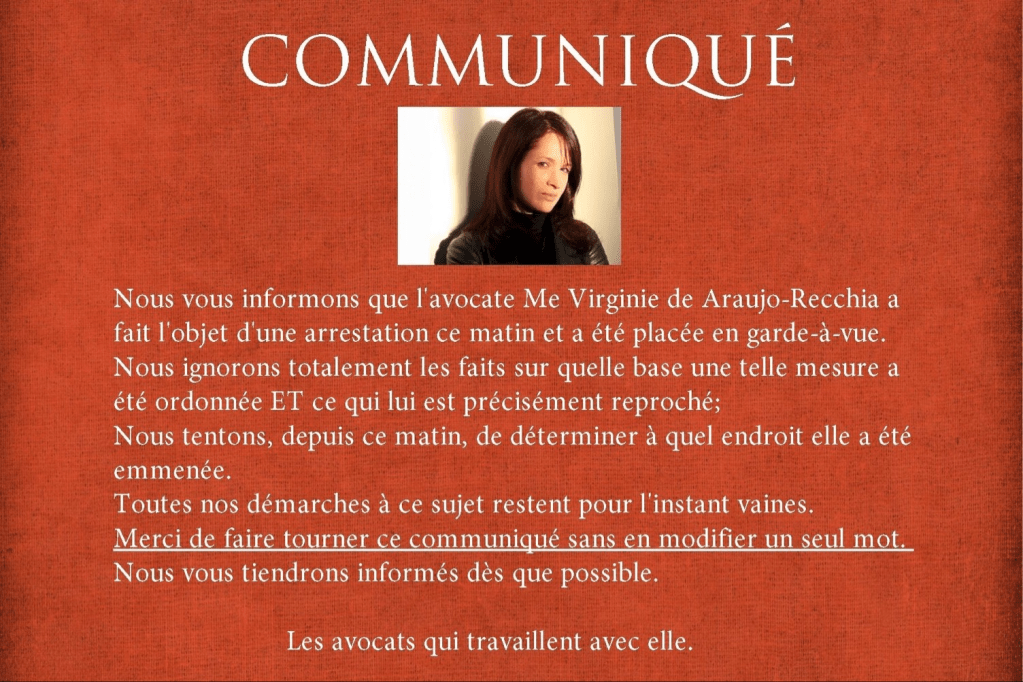 L’avocate Virginie de Araujo-Recchia arrêtée et placée en garde à vue Publié le 24 mars 2022 par la Solognote Urgent: À toi, Virginie! Partager : Cliquer pour partager sur X(ouvre dans une nouvelle fenêtre) X Cliquez pour partager sur Facebook(ouvre dans une nouvelle fenêtre) Facebook J’aime chargement… Similaire