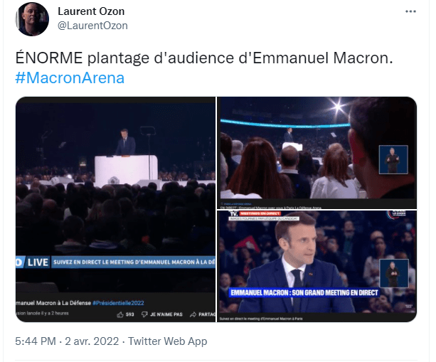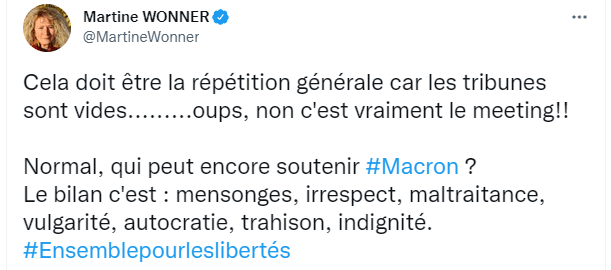 le meeting de Macron, un bide mais les médias gagas Publié le 3 avril 2022 par la Solognote '' Macron qui fend la foule, des images impressionnantes des pancartes dady'' 🤣 c'est l'extase absolue sur les plateaux pic.twitter.com/cu8PF8UQYL— Carter john (@Carterj37919661) April 2, 2022 Partager : Partager sur X(ouvre dans une nouvelle fenêtre) X Partager sur Facebook(ouvre dans une nouvelle fenêtre) Facebook J’aime chargement… Similaire