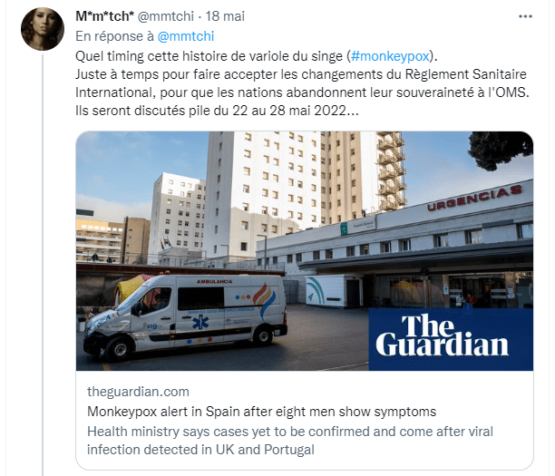 la relève pandémique : la variole du singe ! Publié le 21 Mai 2022 par la Solognote Partager : Cliquer pour partager sur X(ouvre dans une nouvelle fenêtre) X Cliquez pour partager sur Facebook(ouvre dans une nouvelle fenêtre) Facebook J’aime chargement… Similaire