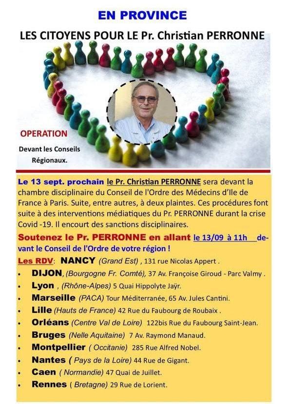 Le Professeur Perronne est convoqué mardi 13 septembre, 9 rue Borromée Paris 15° devant la chambre disciplinaire du conseil de l’ ordre des médecins de PARIS .