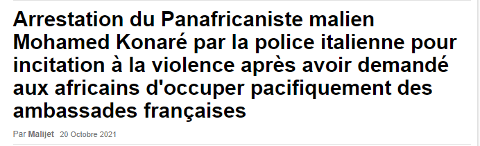 arrestation du panafricaniste Mohamed Konaré Publié le 3 octobre 2022 par la Solognote Partager : Cliquer pour partager sur X(ouvre dans une nouvelle fenêtre) X Cliquez pour partager sur Facebook(ouvre dans une nouvelle fenêtre) Facebook J’aime chargement… Similaire