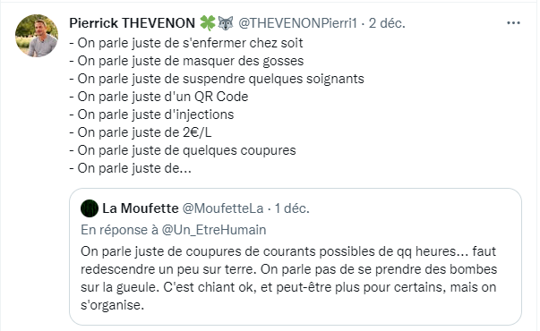 enfants privés d’école en cas de coupures électriques Publié le 5 décembre 2022 par la Solognote Pap n’diaye vient d’annoncer que nos enfants seraient privés d’ecole le matin en cas de coupure d’électricité cet hiver ! On va accepter ça jusqu’à quand ? pic.twitter.com/9dlK3QY7sv— Myriam Palomba (@myriampalomba) December 1, 2022 Partager : Cliquer pour partager sur X(ouvre dans une nouvelle fenêtre) X Cliquez pour partager sur Facebook(ouvre dans une nouvelle fenêtre) Facebook J’aime chargement… Similaire