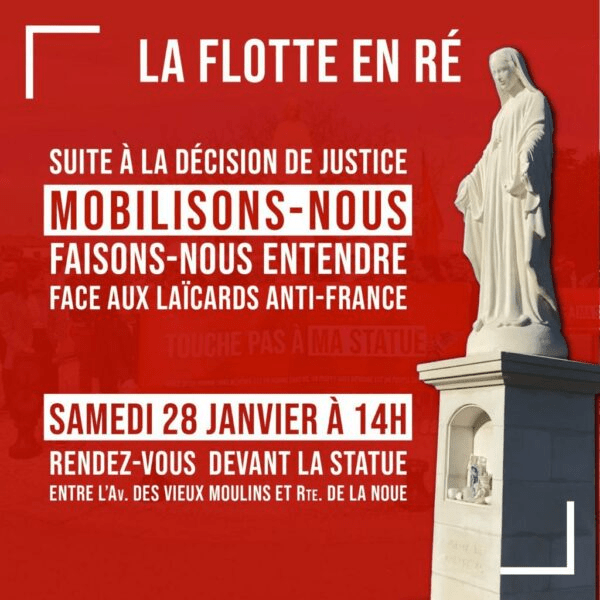 rassemblement contre le déboulonnage de statue de Marie à l’île de Ré Image Publié le 18 janvier 2023 par la Solognote Partager : Cliquer pour partager sur X(ouvre dans une nouvelle fenêtre) X Cliquez pour partager sur Facebook(ouvre dans une nouvelle fenêtre) Facebook J’aime chargement… Similaire