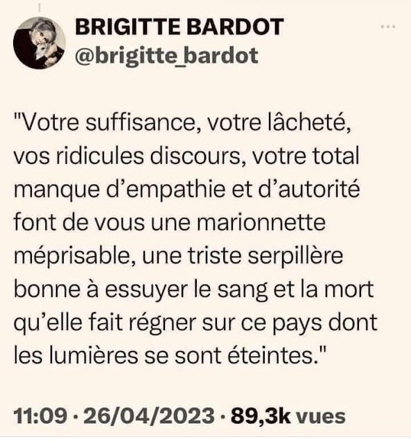 Brigitte Bardot Image Publié le 2 Mai 2023 par la Solognote Partager : Cliquer pour partager sur X(ouvre dans une nouvelle fenêtre) X Cliquez pour partager sur Facebook(ouvre dans une nouvelle fenêtre) Facebook J’aime chargement… Similaire