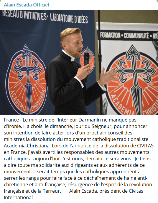après Civitas, G Darmanin dissout le mouvement catholique « Academia Christiana » Publié le 11 décembre 2023 par la Solognote Répondre